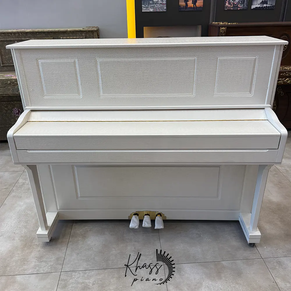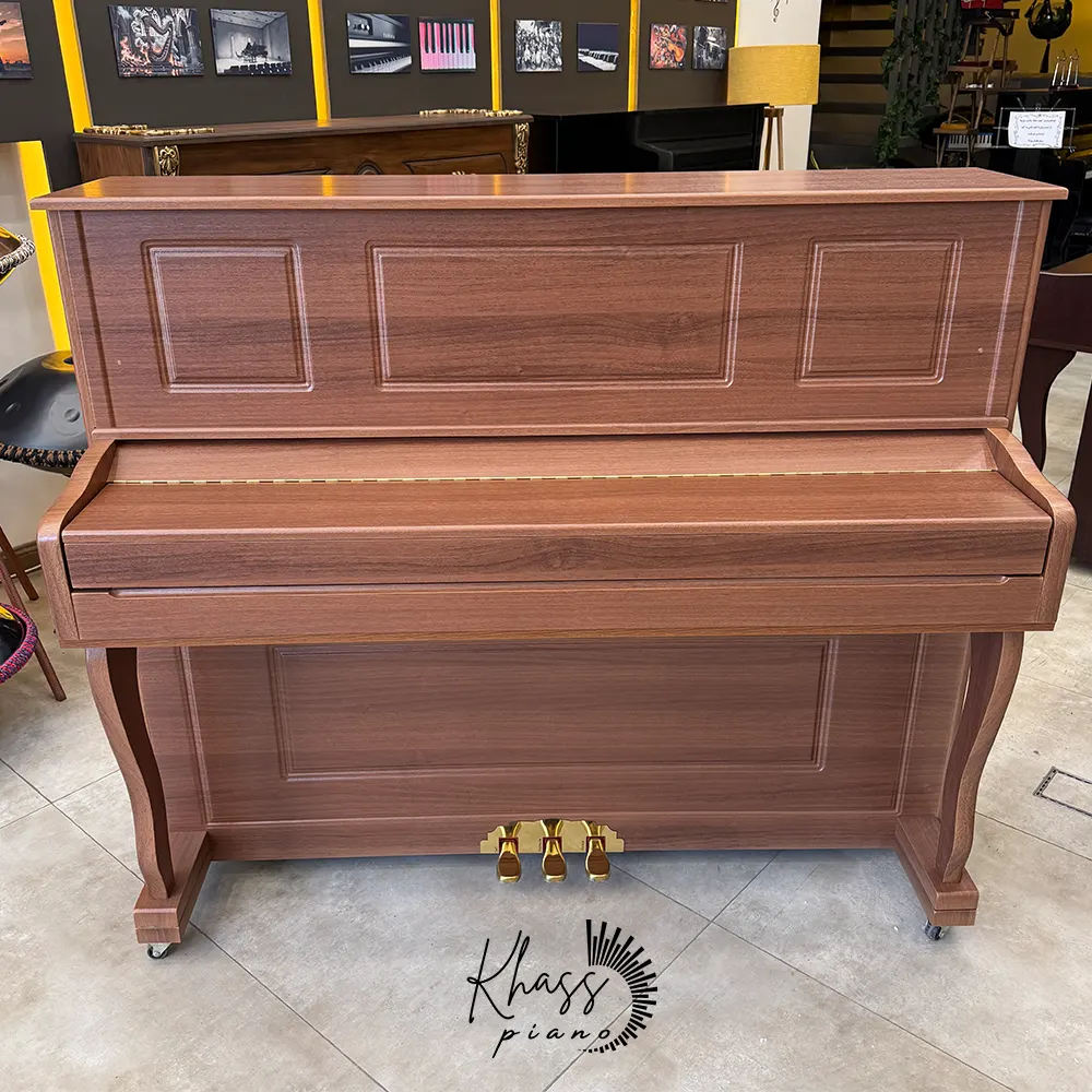 بدنهی این مدل با روکش وکیوم باکیفیت پوشش داده شده که علاوه بر ظاهر لوکس و براق، مقاومت بسیار بالایی در برابر خط و خش، رطوبت و تغییر رنگ دارد. این روکش باعث میشود پیانو بعد از سالها استفاده، همچنان ظاهر اولیهی خود را حفظ کند. طراحی کابینت بهصورت کاملاً آکوستیک انجام شده؛ یعنی وقتی پیانو در فضای خانه یا آموزشگاه قرار میگیرد، از نظر بصری تفاوت چندانی با پیانوی آکوستیک واقعی ندارد.